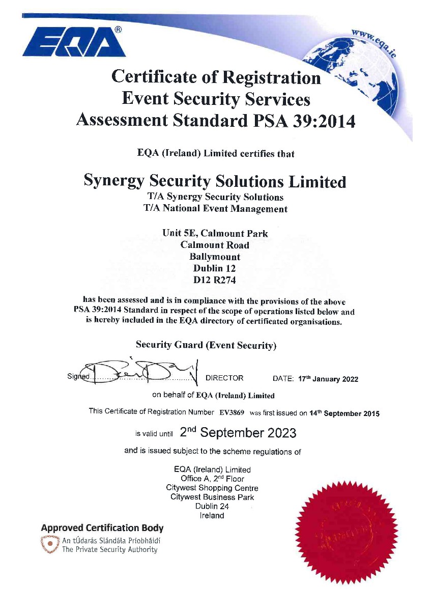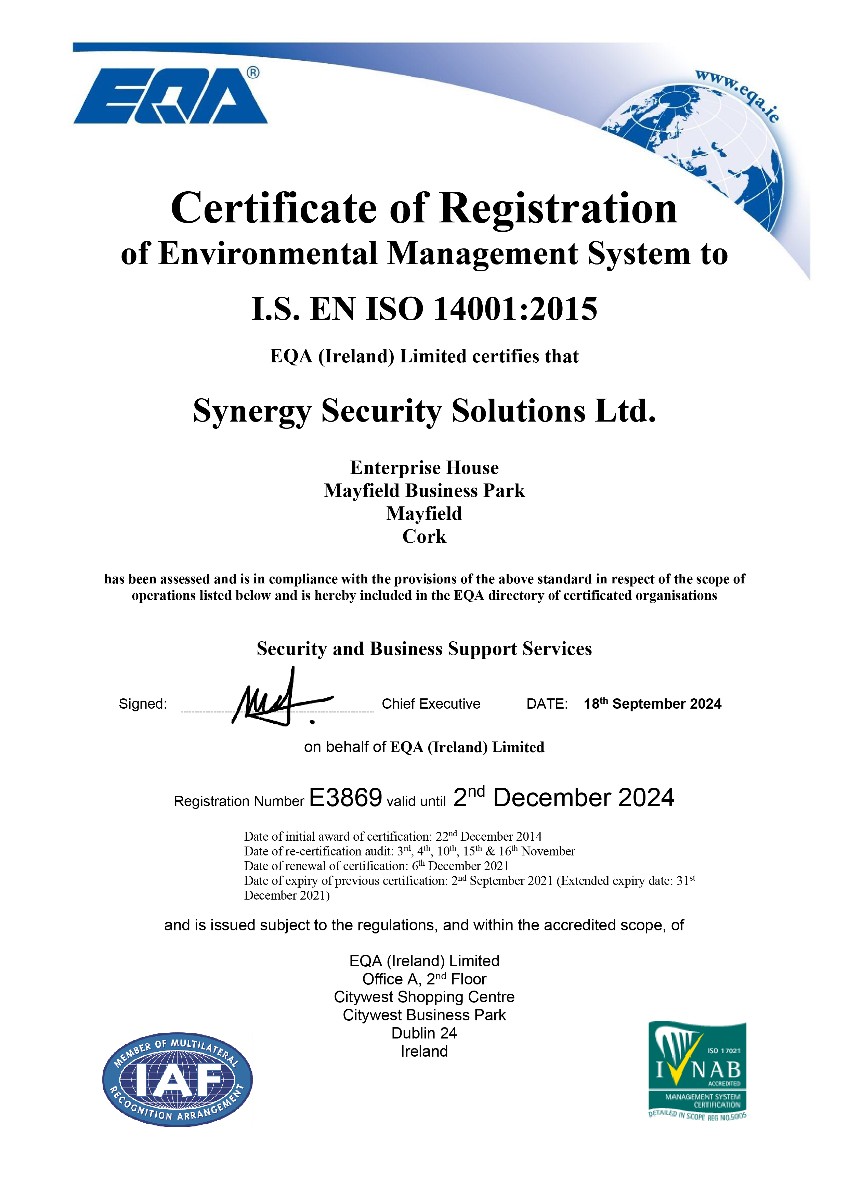 In recognition of Synergy’s high standards, the company has received the EQA accredited ISO 9001, 14001, 45001 and 27001, PSA 28:2013 and PSA 39:2014 quality standards, the Excellence through People award, Safe Contractor status and the ISIA Qualsec Platinum Level - Quality mark. Our management team carries out spot checks/supervisory visits and these form part of our Quality Management System.